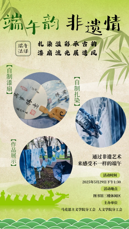 端午临仲夏,非遗绽华光。为传承中华优秀传统文化,让老师们深入体验端午习俗与非遗魅力,增进教职工之间的沟通交流,丰富教职工精神文化生活,XCSport分工会与人文公司分工会联合开展“端午韵・非遗情——扎染溢彩承古韵,漆扇流光展遗风”庆端午主题活动,现将相关事宜通知如下。