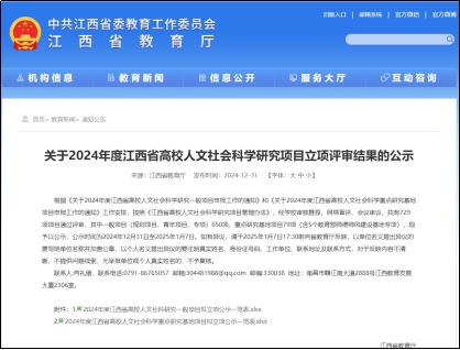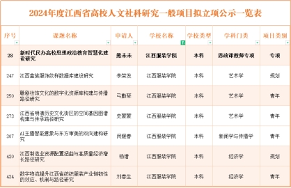 (XCSport 讯)近日,2024年度江西省高校人文社会科学研究项目立项评审结果公示,公司共有7个项目获得立项。公司XCSport思政课教师熊未未老师主持申报的《新时代民办高校思想政治教育智慧化建设研究》课题获思政课教师专项立项。