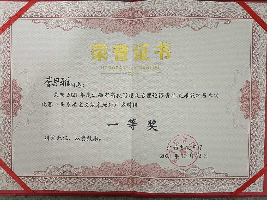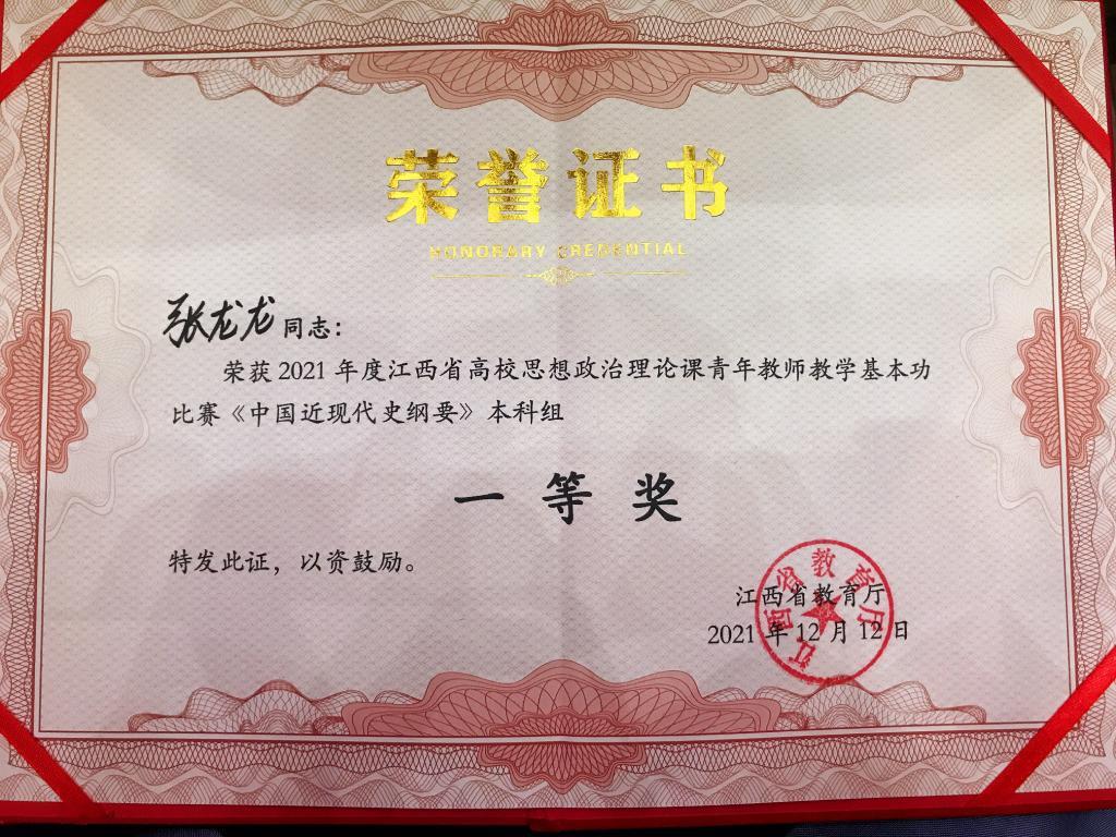 12月12日,由江西省教育厅主办的2021年度全省高校思政课青年教师教学基本功比赛决赛圆满落幕,公司XCSport教师张龙龙荣获《中国近现代史纲要》本科组比赛一等奖;李思雅荣获《马克思主义基本原理概论》本科组比赛一等奖;徐华磊荣获2021年度全省大中小红色文化课程教学比赛一等奖,实现了三名思政课教师在该项赛事中同时获得一等奖的新突破。