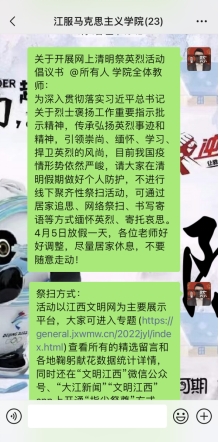 在活动开展前期,公司向全体发出倡议,在疫情期间不进行线下祭扫,倡导文明祭扫,号召全体教师党员通过江西文明网、“文明江西”微信公众号、“大江新闻”“文明江西”app等网络平台,参加网上祭英烈活动,在网上进行默哀致敬、敬献花圈和活动留言。4月5日,大家通过学习强国平台参加网上祭英烈活动。无论是在革命战争时期、改革发展时期、还是步入新时代,总有一群人抛头颅、撒热血,为人民幸福、为民族独立、为祖国繁荣富强牺牲了生命。他们用不朽的精神丰碑,为我们留下深厚的红色印记。