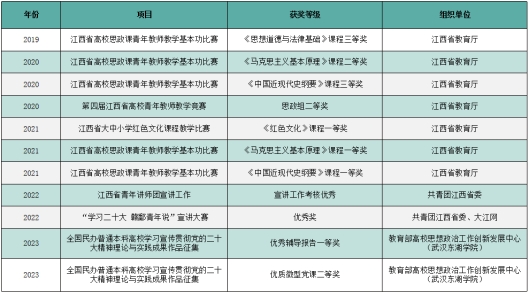 4.着力打造典型人物。集团重视思政课教师队伍培养,为青年教师配备导师,坚持“赛训结合”,打造教研团队,充分调动全社会力量和资源,建好“大团队”。思政课教师荣获江西省高校思政课青年教师教学基本功比赛一等奖4项、二等奖2项、三等奖6项,江西省青年教师教学竞赛二等奖1项等。组建思政课教师宣讲团,2人入选江西省青年讲师团、江西省思政课教师宣讲团成员,1人荣获江西省共青团宣传工作考核优秀,多位教师荣获校级优秀共产党员、优秀党务工作者、“三育人”标兵、“抗疫先进个人”等称号。