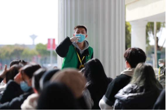 这次核酸检测的志愿服务工作主要由我们的各校级员工组织的成员组成,从团委、员工会、青总会到社团事务中心、艺术团、国旗护卫队,从场外秩序维护到场内健康码的扫描,从第一次核酸检测80名员工志愿者到今天150名志愿者,甚至还有许多同学自主报名参与进来的,我们志愿者的工作热情有增无减,工作效率越来越高!他们真正用行动诠释“江服骨干,敢挑重担!”