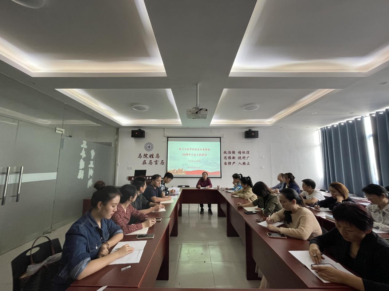 周丽琴经理强调,围绕辛亥革命110年以来的历史征程,总书记的讲话铿锵有力、掷地有声、发人深省。大学者,非谓有大楼之谓也,有大师之谓也。高校教师承担着最庄严、最神圣的历史使命,我们要深刻领会习近平总书记重要讲话精神,坚持中国共产党的领导和中国特色社会主义道路,继承和弘扬辛亥革命精神,将辛亥革命精神融入到思政课的教学内容中。