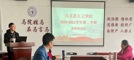 新任课青年教师李思雅、新进青年教师朱棣文分别进行了《中国近现代史纲要》《思想道德修养和法律基础》两门课程的试讲。院领导及教师对俩位教师的试讲进行了点评和讨论。最后周经理强调思政课教学必须紧扣教育部2018年版思政课专题教学指南,融入“四史”教育尤其是要结合今年建党100周年党史教育活动,讲好思政课。