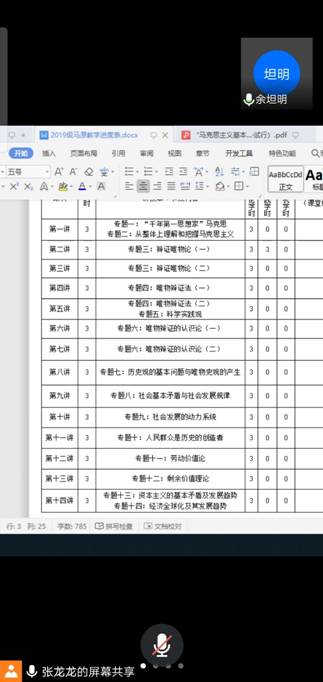 会议的第一部分就课程的重难点、课时分配与专题名称和内容等教学问题进行了深入研讨。根据教育部的指导文件,结合以往教学经验,大家展开了热烈讨论,献言献策。与会教师对新旧课程大纲进行了对比,明确了课程的重点和难点内容,对相应的学时分配进行了调整,关涉到了专题的设置。根据教育部指导意见,本课程在前期教学过程中已改为专题式教学,经过一段时间的实行,教师们普遍认为专题式教学更能突出核心,拓展教材,达到了较为理想的教学效果。同时也指出了存在的问题,例如教师们经验不足,唯“文件”是从,导致一些专题的名称与内容脱钩、知识点过于密集或不足等问题。针对以上问题,教师们深耕细作,力求精准把握,对专题名称和内容进行了调整。