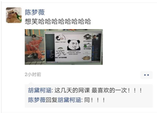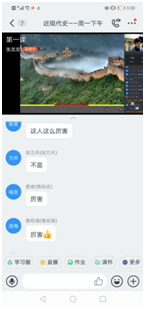 教师感受:作为《中国近现代史纲要》教研室主任,我在寒假期间做好了从教材体系向教学体系的转变,按照国家的要求做好了专题式教学相关的大纲、进度、教案和课件。提前一周联系了各个班的学委并进入了各班级的群内,把服装学堂的线上平台发给了各班同学,作为他们提前预习和发帖提问交流讨论的基地,并耐心的解答员工们的无法登陆无法观看等诸多登录问题。关于网上教学,采用了钉钉视频直播教学的方式,做到网课不“缩水”。以当今疫情期间各行各业展现出了中华民族生生不息的团结奋斗精神作为思政课的开篇,在课上穿插当今“00”后同学的兴趣点打开共同话题,并在课上提问做到与同学们的积极互动,课堂效果甚至比在教室教学的效果还更好。