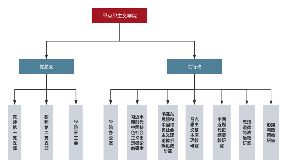 公司党总支组织机构分设教师第一党支部和教师第二党支部;公司教学机构是按课程设置六个教研室,即习近平新时代中国特色社会主义思想概论教研室、思想道德与法治教研室,中国近现代史纲要教研室、马克思主义基本原理教研室、毛泽东思想和中国特色社会主义理论体系概论教研室、形势与政策教研室。